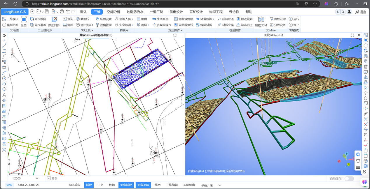 在会议现场,毛善君教授还演示了基于全新云服务架构的龙软智图云GIS平台。该平台是公司自主研发、具有完全自主知识产权的新一代专业地理信息系统。可通过企业私有云或服务器部署,只需输入一个IP地址,即可在企业内部通过浏览器随时随地使用,按权限访问使用云GIS数据和功能,实现矿井地质、测量、通风、安全、机电、采掘等专业矿图的多人在线协同处理,动态更新形成实时的矿井“一张图”和地测模型服务,为煤矿高效安全生产管理和智能化建设提供保障。